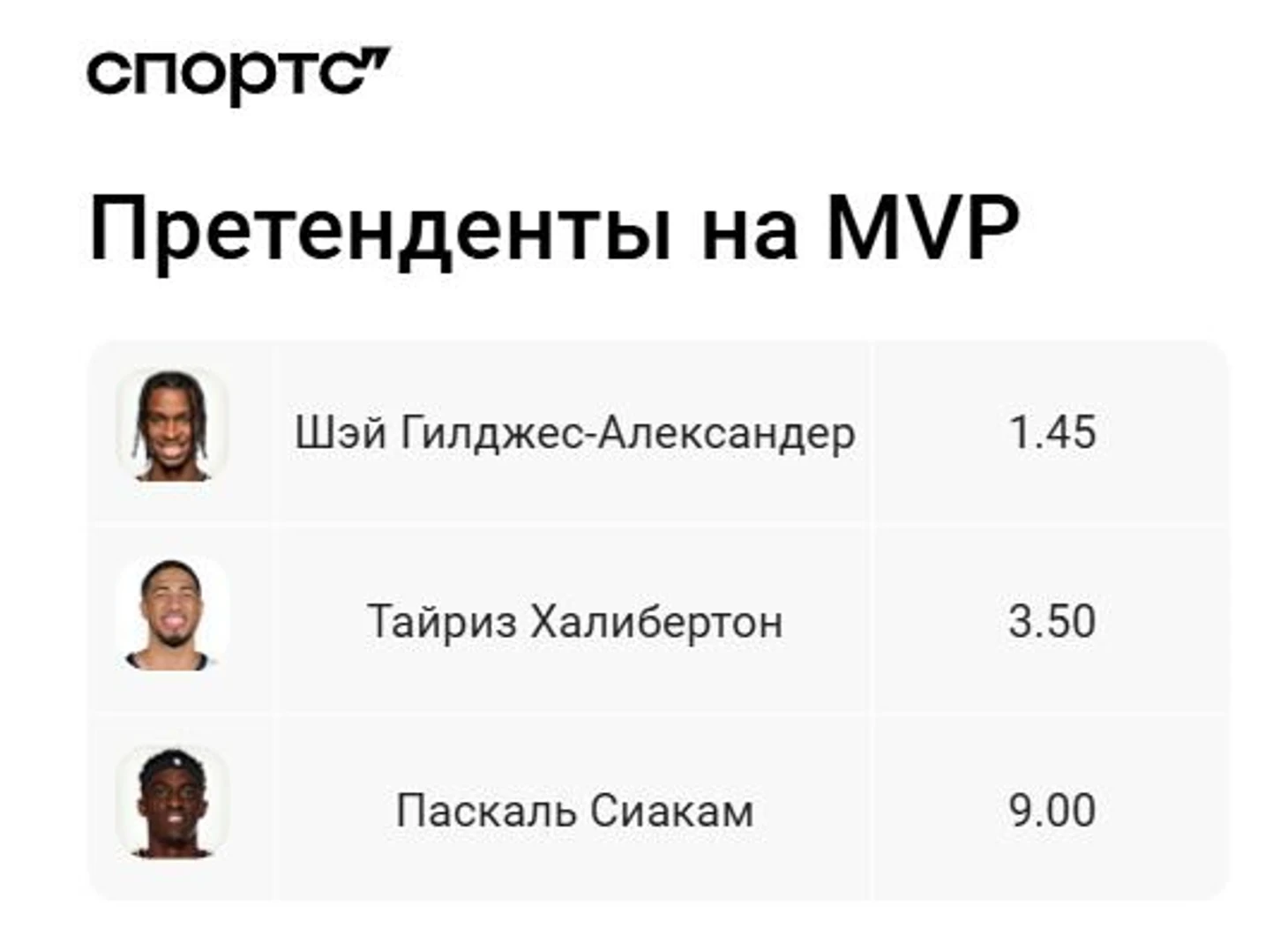 Уже нет 80% на Шэя Гилджес-Александера. Теперь Тайриз Халибертон стоит вторым с живым коэффициентом 3.50 на главную индивидуальную награду плей-офф.