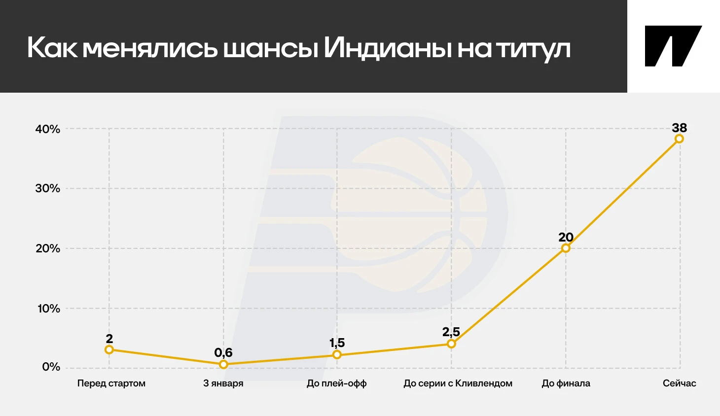 Вот безумный график «Индианы». Еще 3 января команда не входила даже в топ-10 фаворитов сезона в НБА. У букмекеров были сомнения и по попаданию в плей-офф, а коэффициент на титул взлетал до 150.00.