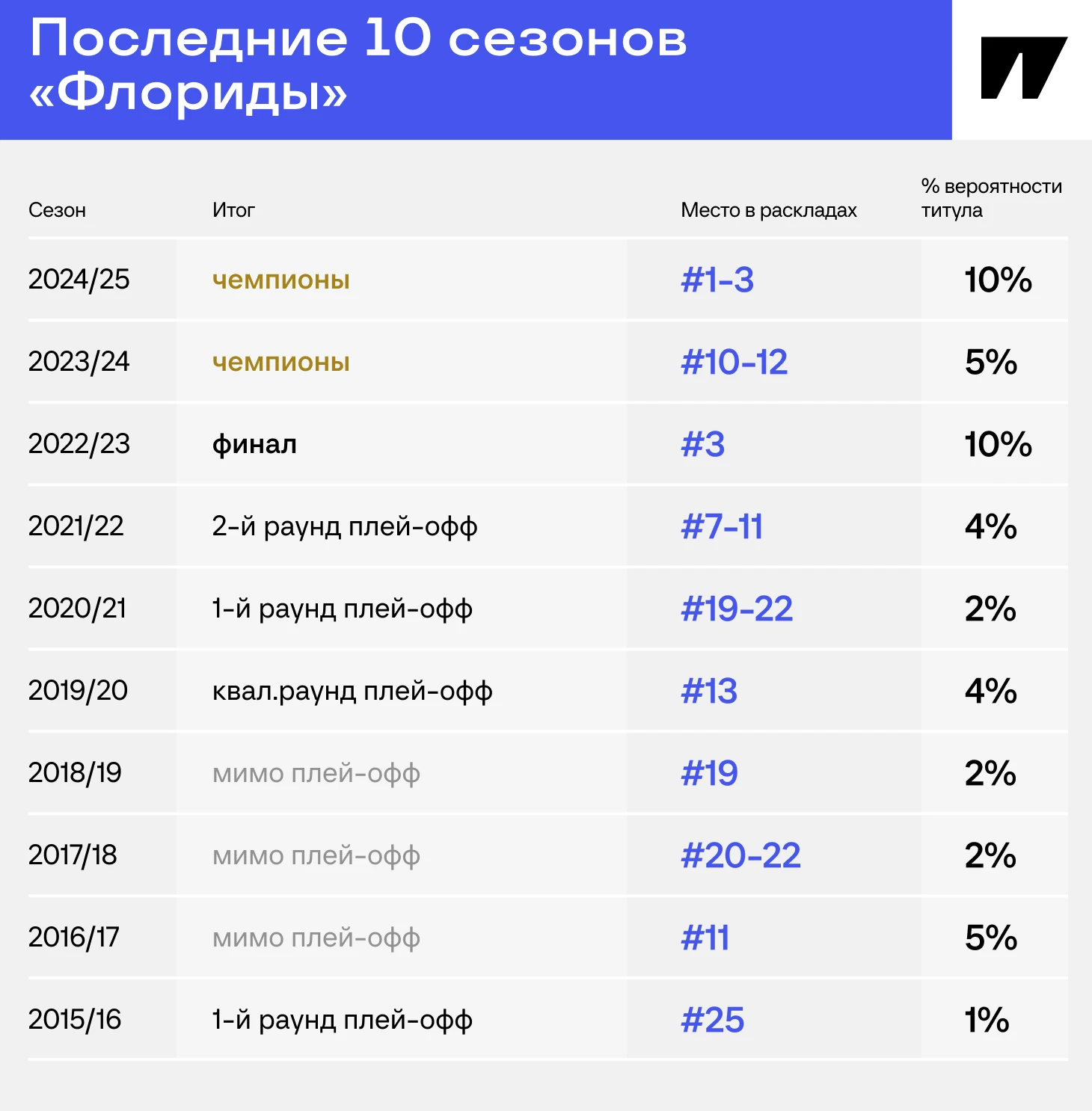 ● До старта «Флорида» шла в тройке главных фаворитов с 10% шансов. Группа претендентов вообще была очень плотной: в диапазоне с 5-10% на успех умещались сразу 13 клубов! Но «Флорида» – вместе с «Колорадо» и «Далласом» – котировалась выше остальных.