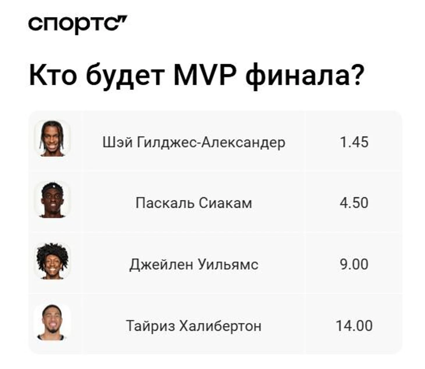 Интересно, что теперь у букмекеров закрались сомнения и насчет Шэя Гилджес-Александера. Если Джейлен Уильямс станет героем седьмой игры, то шансы точно будут – вероятность выше 10%.