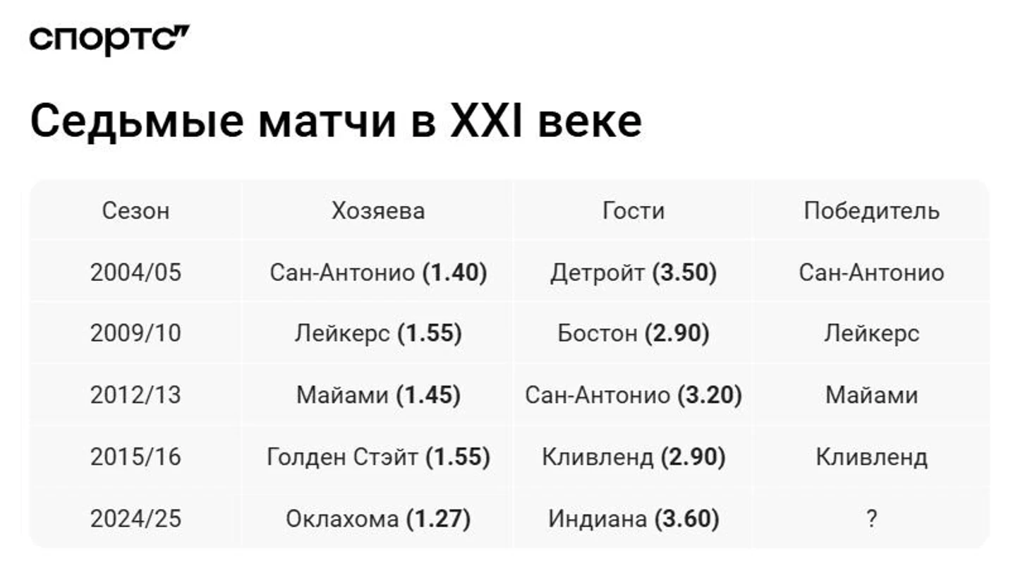 До этого в XXI веке в седьмых матчах выигрывали только фавориты. «Майами» дома дожал «Сан-Антонио» в сезоне-2012/13, «Лейкерс» вырвали титул у «Бостона» в 2010-м, а «Сан-Антонио» закрыл серию против «Детройта» в 2005-м.
