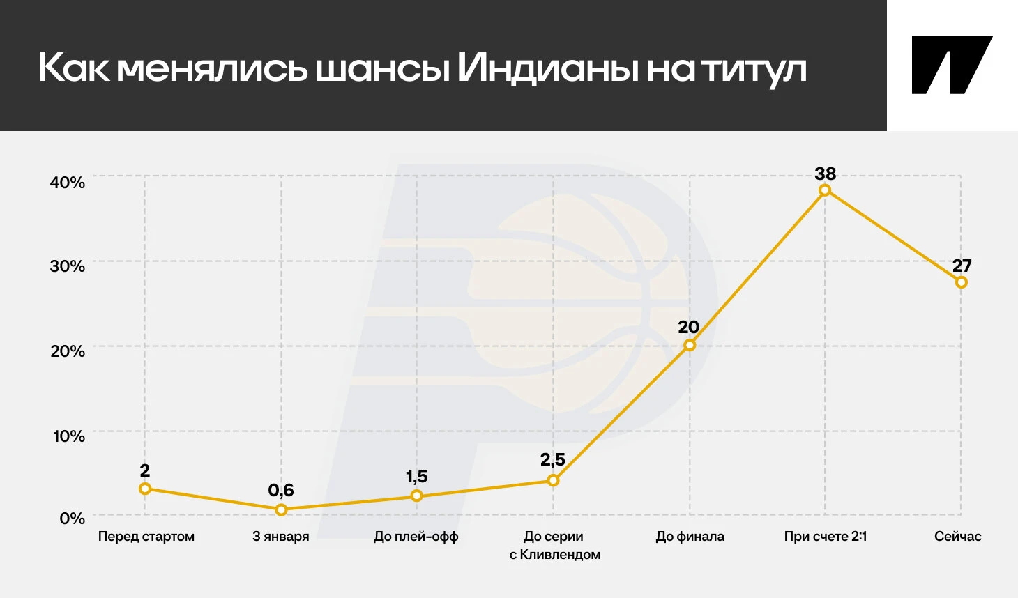 Интересный кейс для букмекеров: «Индиана» была андердогом во всех матчах финала – прогнозы не сыграли уже в третий раз. До шестой встречи коэффициент держался в диапазоне 2.70-2.80, а на титул можно было поймать 15.00.