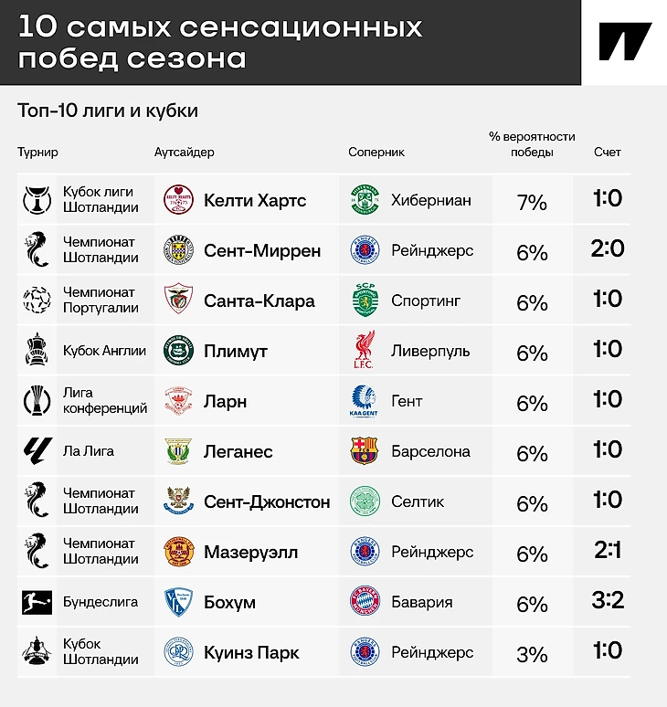 За пределами этой десятки было несколько запоминающихся результатов. Например, в АПЛ «Ливерпуль» проиграл дома «Ноттингем Форест», а «Арсенал» – «Вест Хэму». Вероятность поражения в этих случаях не превышала 8-9%.