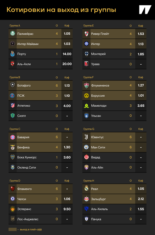 На клубном чемпионате мира прошло два тура. Интриг на третий тур хватает: мы подробно разобрали, кому что нужно, в этом материале. Например, «Интер» и «Атлетико» рискуют не выйти в плей-офф. Однако букмекеры уже все подсчитали. Смотрим, как завершится групповой этап по их версии.