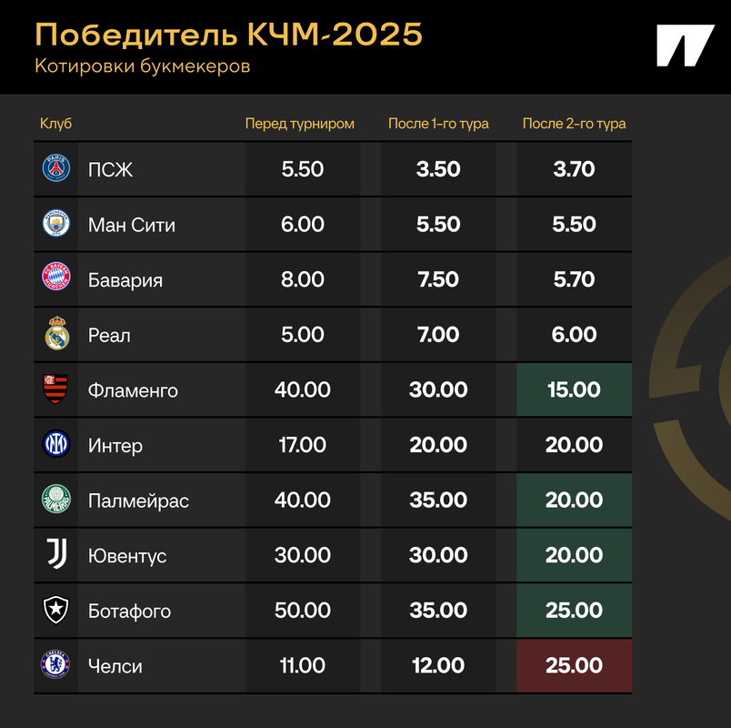 Перед турниром в первой десятке были только европейские клубы, теперь – сразу три бразильских. «Фламенго» ворвался в топ-10 после первого тура, «Палмейрас» и «Ботафого» подтянулись после второго. К тому же бразильские команды лидируют в четырех из восьми групп. Шансы на чемпионство клуба из Южной Америки выросли в 1,5 раза.