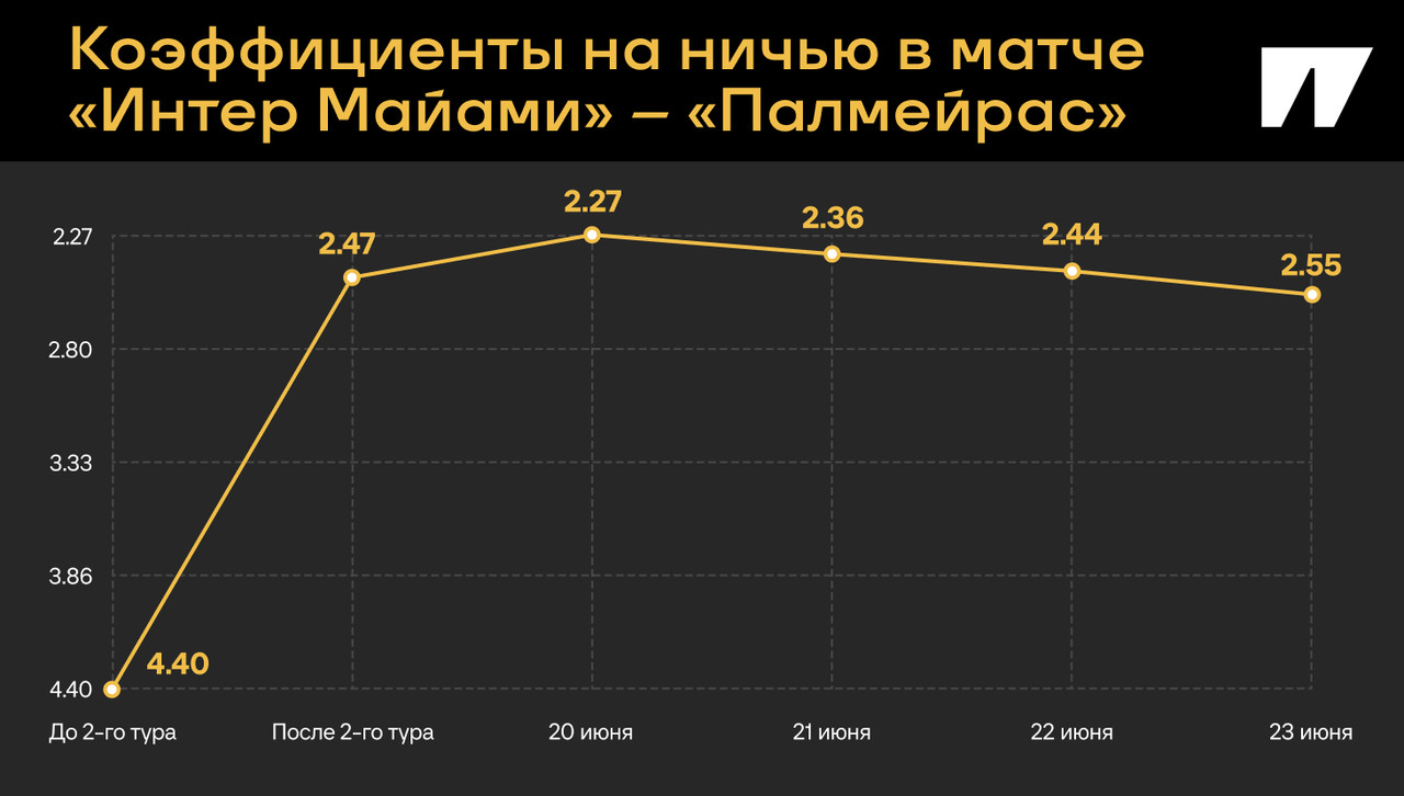 Ничья в матче «Майами» – «Палмейрас» открывалась коэффициентом 4.50, а перед вторым туром держалась на 4.40.
