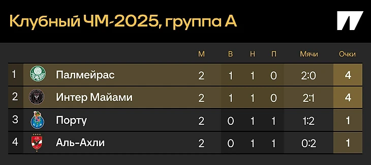 «Палмейрас» выше «Майами» за счет разницы голов. При ничьей американцы и бразильцы наберут по пять очков. В таком случае ни «Порту», ни «Аль-Ахли» их не достанут. «Майами» и «Палмейрас» синхронно выйдут в плей-офф и заодно заработают 17 млн долларов призовых на двоих.