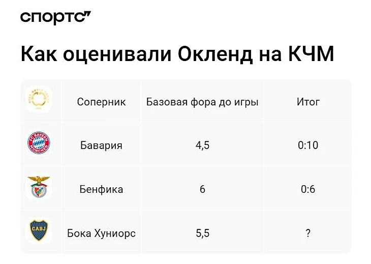 Любопытно, что до игры с «Баварией» букмекеры пропустили информацию о странном составе «Окленда». В связи с этим ожидалась рядовая победа с разницей в четыре-пять мячей. Например, даже на фору (-4,5) можно было ловить коэффициент 1.65, а в итоге дело закончилось 10 голами.
