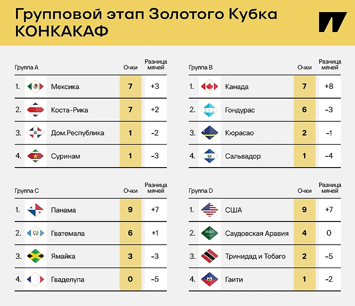 ● В группе В Канада уверенно взяла семь очков, а были бы все девять, если бы не пропущенный на 90+4 гол от Кюрасао – сыграли 1:1. Хотя соперник забил трижды, но два раза из офсайда.