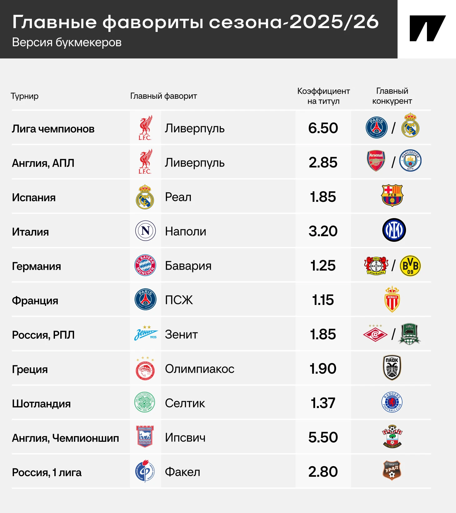 ● В АПЛ выделяется тройка: «Ливерпуль», «Арсенал» и «Ман Сити» в диапазоне 2.85-3.30, только потом с 14.00 идет «Ньюкасл». В прошлом сезоне те же три команды были в топе, только «Ливерпуль» подальше от «Арсенала» и «Сити».