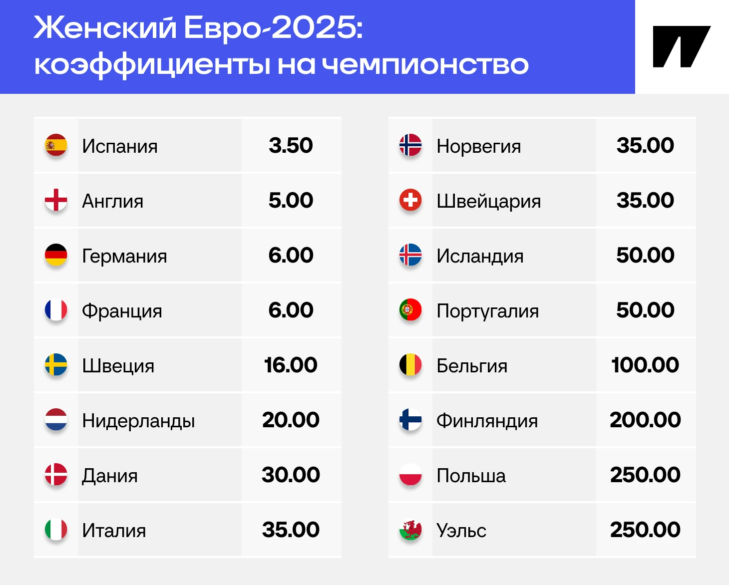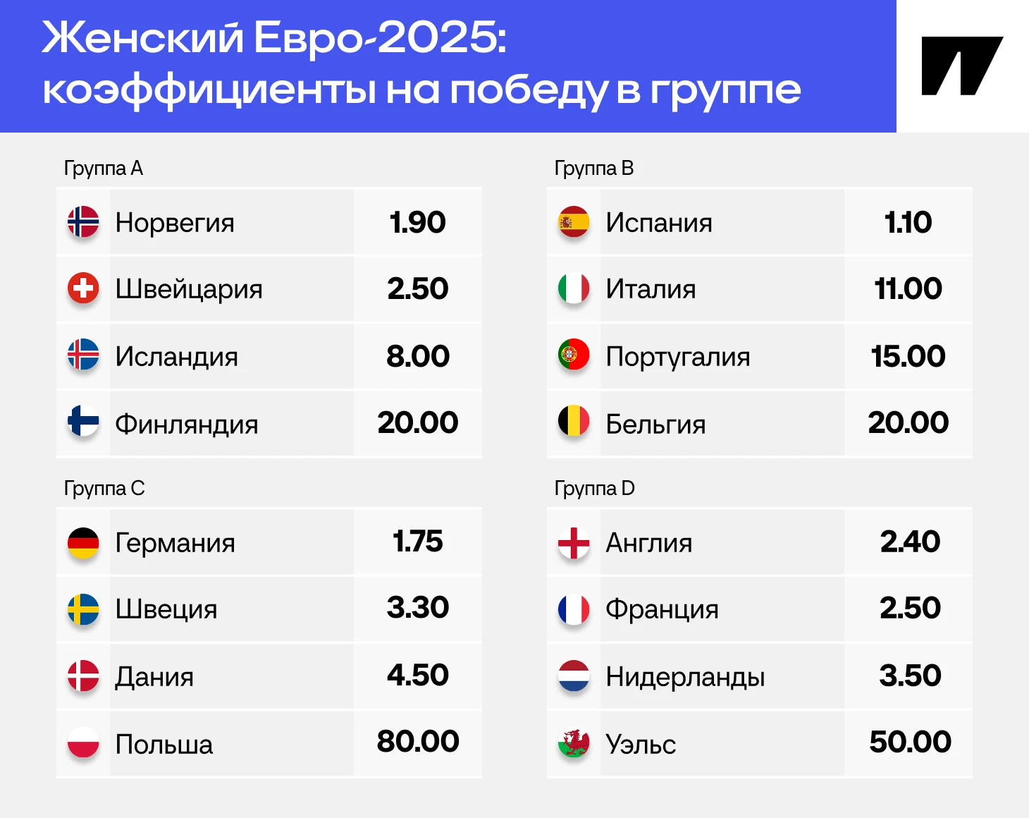 Главный претендент на второе место – Италия с тренером Андреа Сончином, он раньше играл за «Фиорентину» и «Аталанту», а в 2022-м тренировал «Венецию», пока после «Спартака» не пришел Паоло Ваноли. Португалию котируют чуть ниже, у них вообще всего один победный матч в истории Евро.