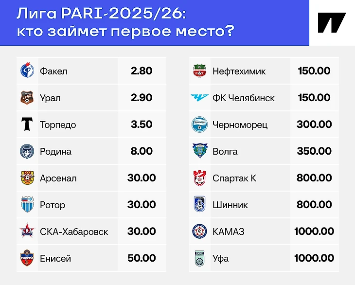 По этим раскладам у букмекеров «Факел» и «Урал» должны пройти напрямую, а «Торпедо» и «Родина» – сыграть в стыках. Но пока выделяются три фаворита.