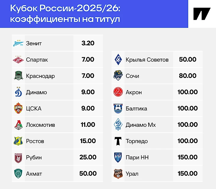 Фавориты Кубка: «Зенит» в отрыве, «Спартак» и «Краснодар» – главные конкуренты, ЦСКА вне топ-3