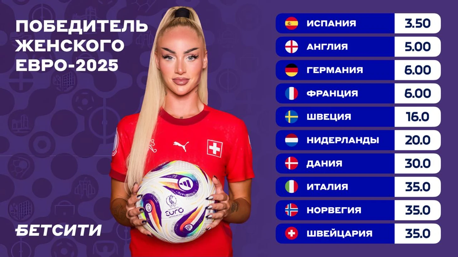 Швейцария – хозяйка ЕВРО-2025. Прежде не добивалась больших успехов на крупных международных турнирах. У многих швейцарская сборная может ассоциироваться с Алишей Леманн или недавним поражением от юношей из «Люцерна» U-15 со счетом 1:7. Победа Швейцарии идет за 35.0.