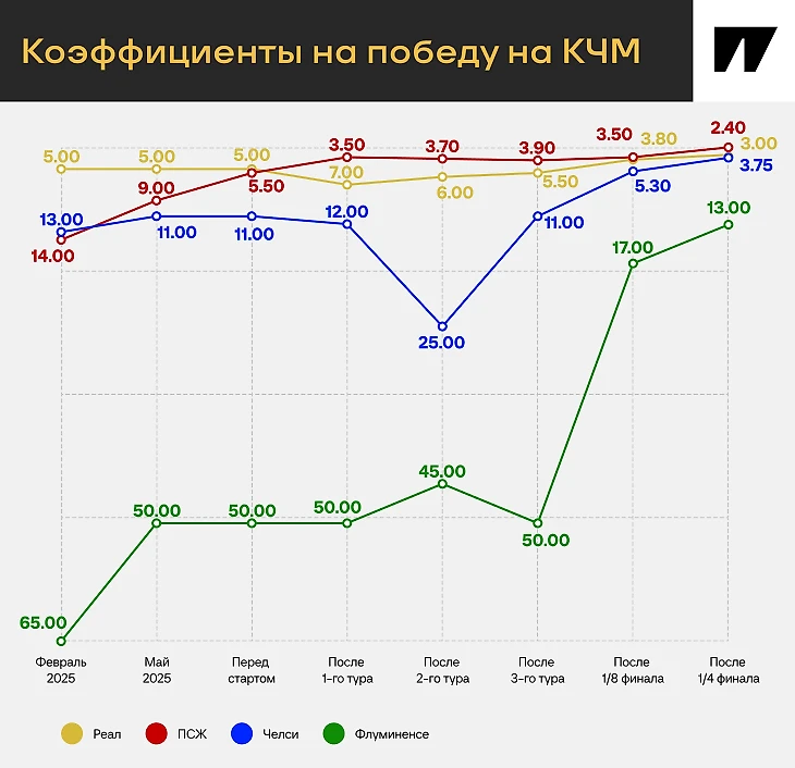Теперь – как менялись шансы всех четырех полуфиналистов на победу на КЧМ по коэффициентам за 2025-й.