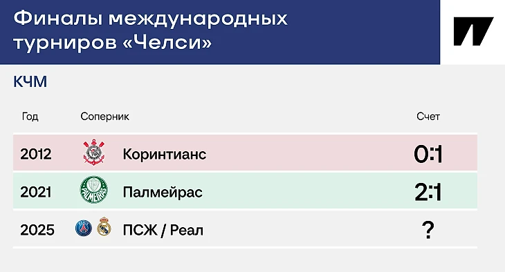 В финалах КЧМ пока 1:1: в 2012-м «Челси» проиграл «Коринтиансу» 0:1 из-за гола перуанца Паоло Герреро. Через девять лет выиграл 2:1 в дополнительное время у «Палмейраса» – на 117-й минуте Хавертц реализовал пенальти. Оба раза по котировкам «Челси» был фаворитом.
