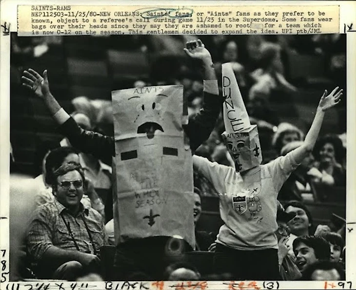 «Святым» все же «сверху» никто не помогал. После 1-15 в 1980-м фанаты начали носить бумажные пакеты на головах, называя команду «Ain’ts». Зачинщиком акции, отголоски которой можно заметить на «Цезарь Супердоум» до сих пор, стал местный спортивный радиоведущий Бадди Дилиберто. Бумажный пакет для ланча на голове стал знаком протеста против ужасной игры «Сэйнтс» и разросся до символа настоящего отчаяния.