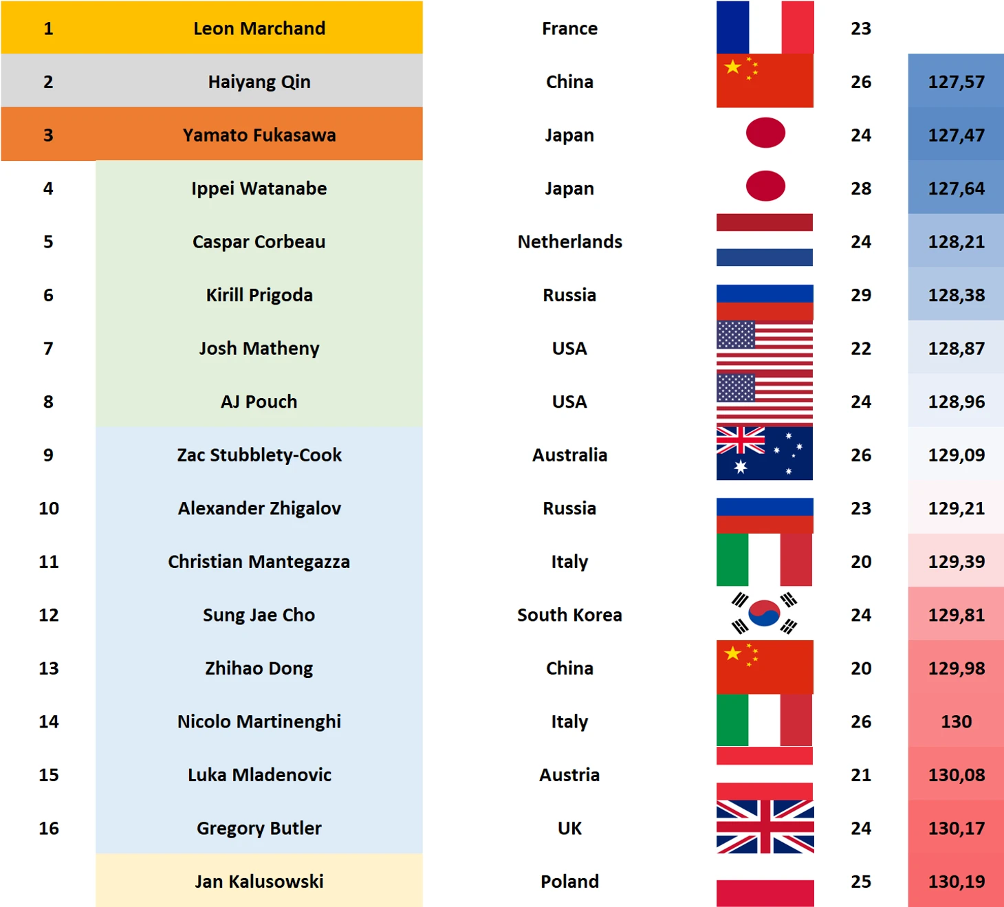 Спина и брасс для России самые ожидаемые с точки зрения медальных перспектив, именно здесь и у мужчин и у женщин наибольшие шансы привезти золото и не одно. На спине мы ждем борьбы Колесникова за оба золота (на 50 и на 100), где ему противостоять, помимо мировых звезд, будут наши парни: Самусенко и Лифинцев.