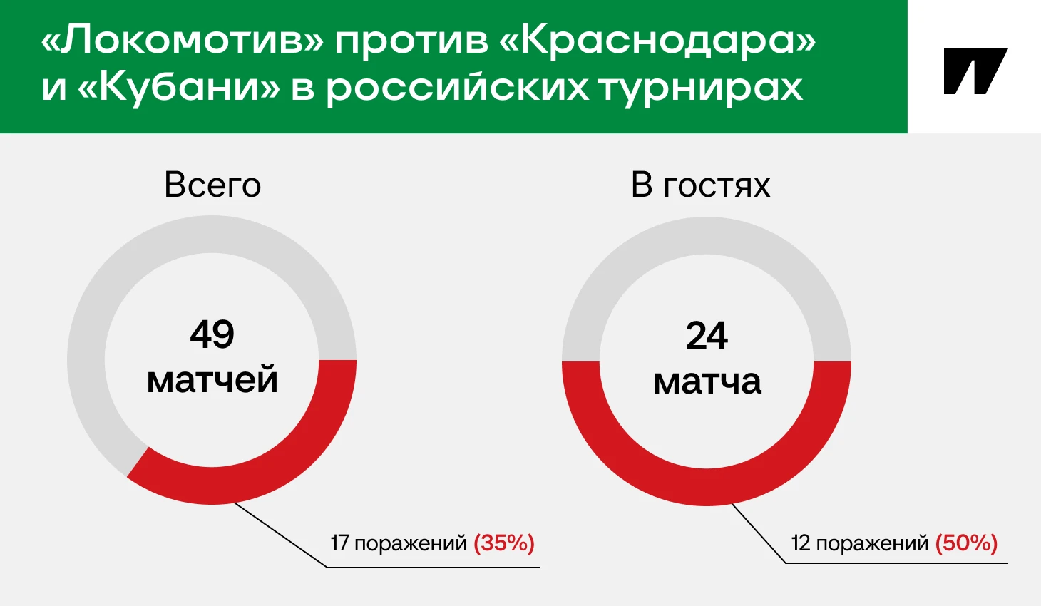 С «Краснодаром» «Локо» играет с 2011 года, с «Кубанью» – в российской истории – с 2004-го. Статистика против каждого из этих клубов вполне адекватная: 14 побед над «Краснодаром» в 30 играх, семь – над «Кубанью» в 19.