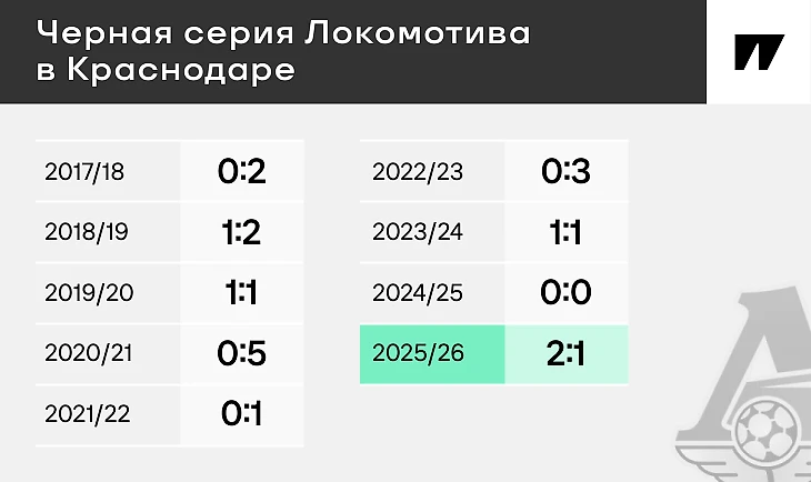 ● Удивительная статистика: «Локомотив» забил только один гол в прошлых пяти краснодарских матчах.