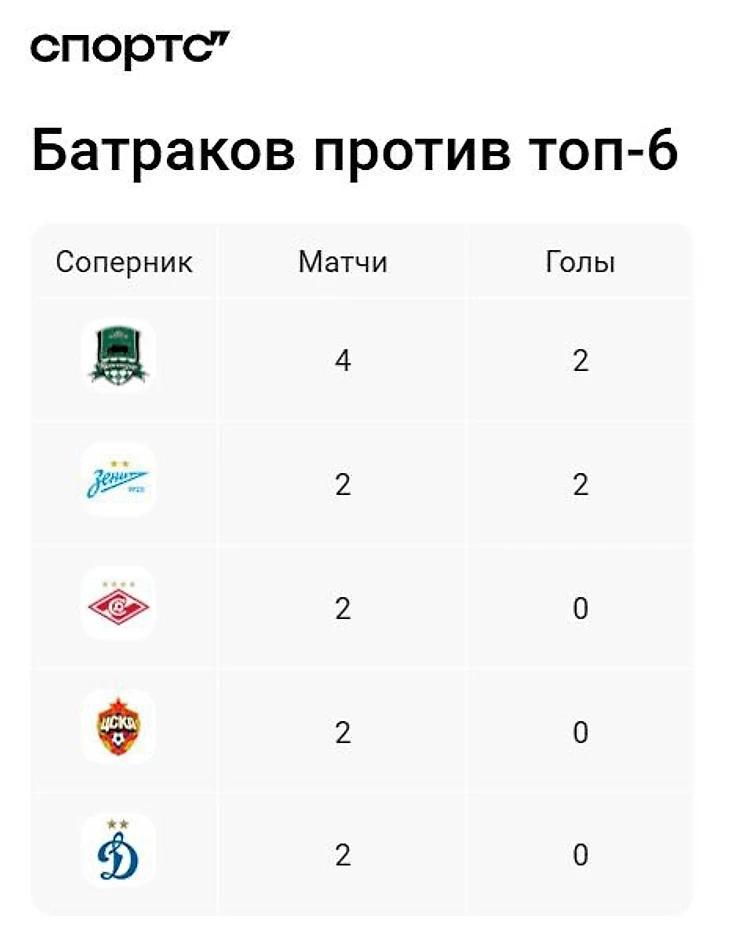 А вот из цифровых аномалий – статистика Алексея Батракова. Так получается, что сейчас в РПЛ нет соперников, кому бы полузащитник забивал один раз – либо два мяча, либо вообще нет голов. Исключение – «Оренбург» (три гола).
