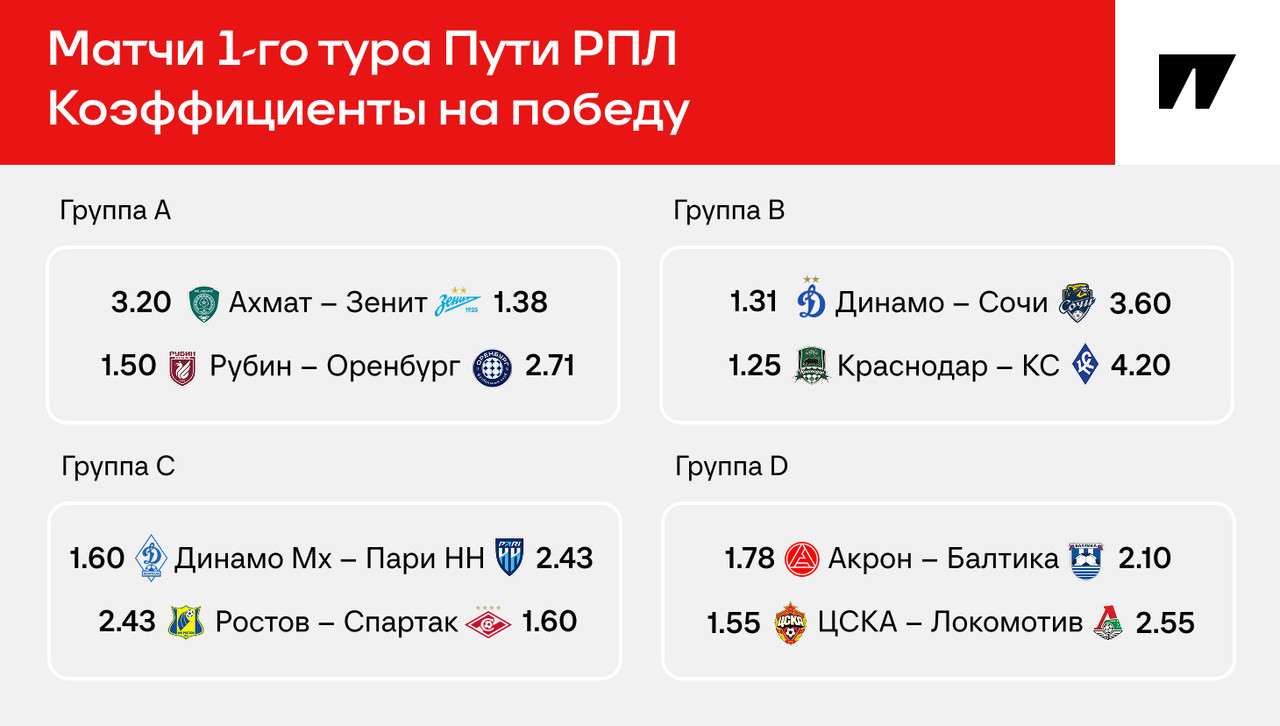 У «Зенита» и «Спартака» не самые тяжелые соперники, а в квартетах B и D уместились по два топа, потому отрыв не так заметен. По раскладам вся топ-восьмерка должна проходить в плей-офф, а в Пути регионов ждут «Ахмат», «Крылья Советов», махачкалинское «Динамо» и кого-то из пары «Балтика»/«Акрон» – кэфы там одинаковые.