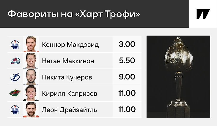 В серию Хеллибака аналитики не верят: голкипер «Виннипега» в новой линии стоит восьмым – позади Никиты Кучерова и Кирилла Капризова. Фаворит – Коннор Макдэвид. Канадец может завоевать приз в четвертый раз.