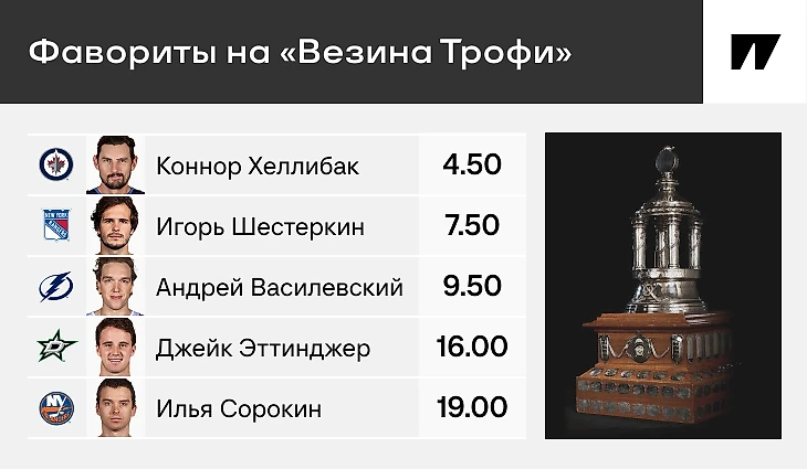 Сразу три россиянина в топ-5 претендентов. В прошлом сезоне лучшим в рамках регулярного чемпионата был голкипер «Виннипега» Коннор Хеллибак. Американец выиграл две «Везины» подряд и три всего.