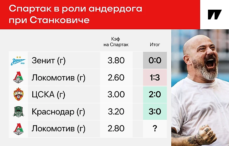 В 33 матчах РПЛ аналитики ставили «Спартак» фаворитом 29 раз. При Станковиче впервые за шесть лет красно-белых вывели в линии даже выше «Зенита». В гостях «Спартак» для букмекеров пока не так убедителен. При этом статус аутсайдера будто бы больше заводит игроков – почти все памятные матчи при Станковиче фиксировались в моменты, когда не было позитивных ожиданий.