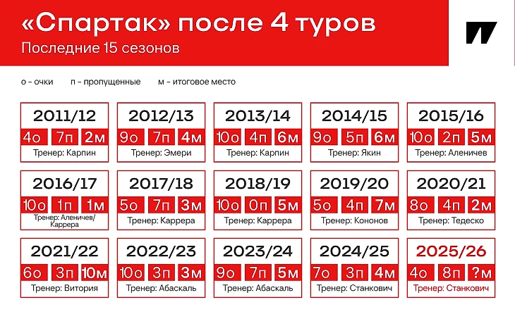 «Спартак проиграл 2:4 «Локомотиву» – и теперь это худший старт команды в лиге с 2011-го. Всего четыре очка и восемь пропущенных за четыре тура.