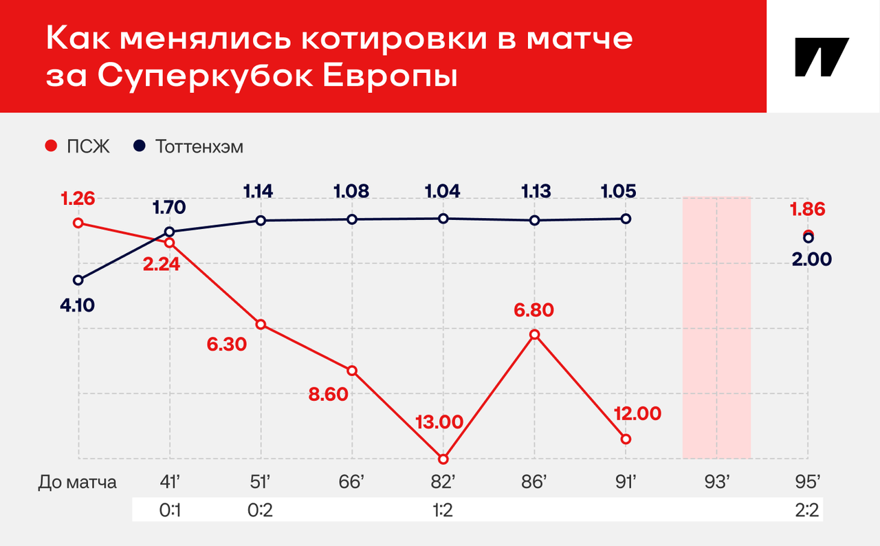 Перед матчем все казалось предсказуемым: кэф 1.26 на «ПСЖ» и 4.10 на «Тоттенхэм». Однако котировки перевернулись уже на 39-й минуте, когда Микки ван де Вен забил, и фаворит перед перерывом сменился.