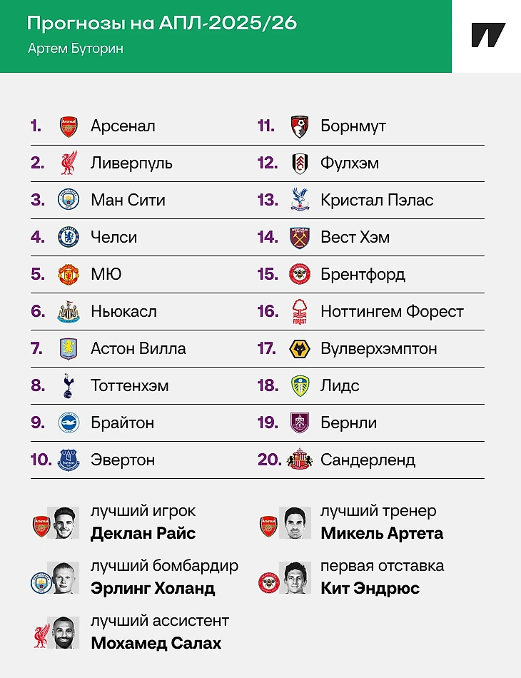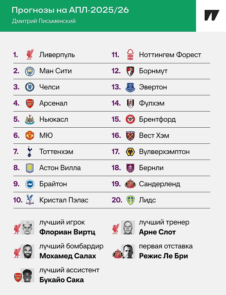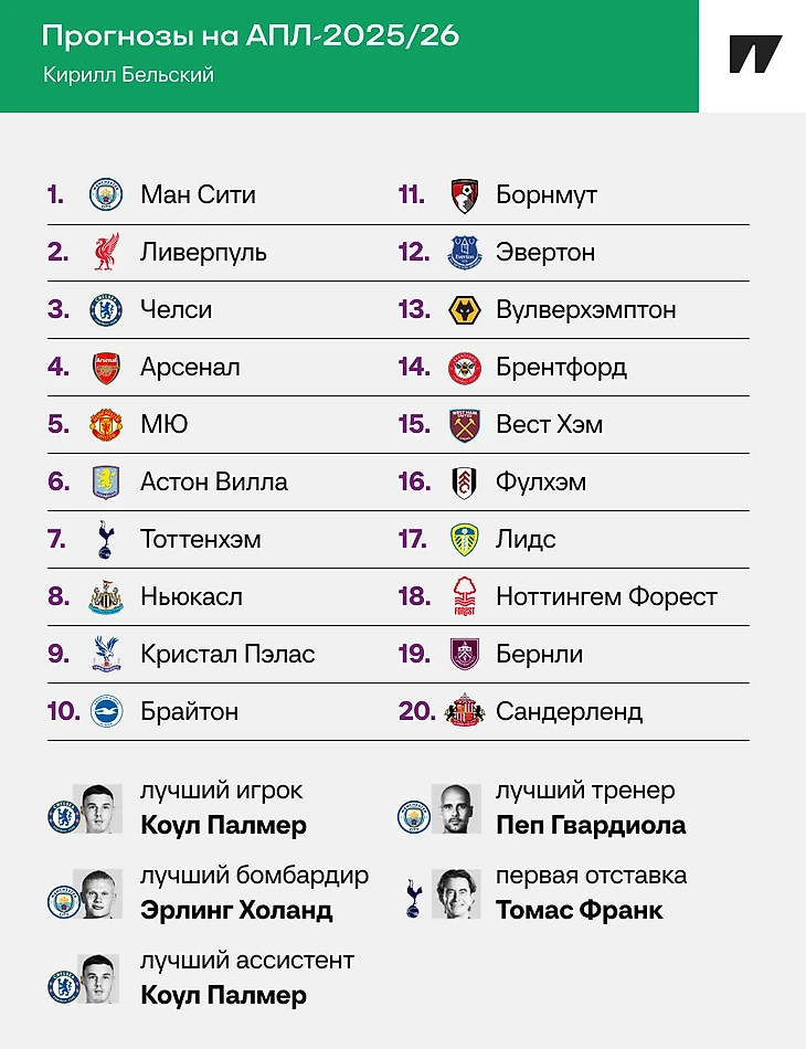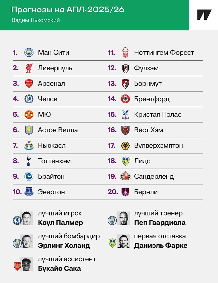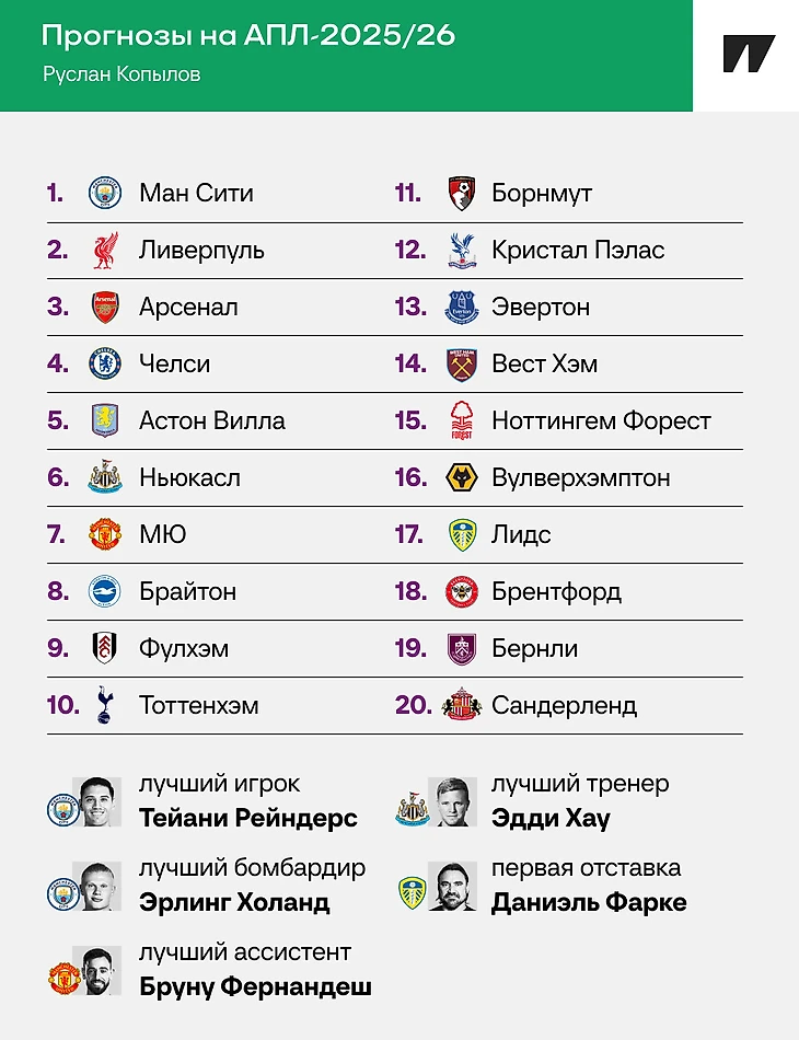 «Ливерпуль» и «Манчестер Сити» по разным причинам попали в большую перестройку и за лето должны были перепридумать себя. У Гвардиолы на это почти не было времени из-за клубного ЧМ, поэтому «Сити» поставил ниже. Впрочем, в тройку вполне может заскочить «Челси» – календарь позволит им резко стартовать.