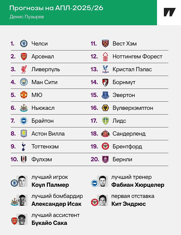 В пятницу стартует новый сезон АПЛ – а значит пришло время прогнозов авторов Спортса’‘. Помимо классического распределения команд по местам в таблице мы попросили назвать кандидатов в еще нескольких номинациях: лучший игрок, лучший бомбардир, лучший ассистент, первая отставка.