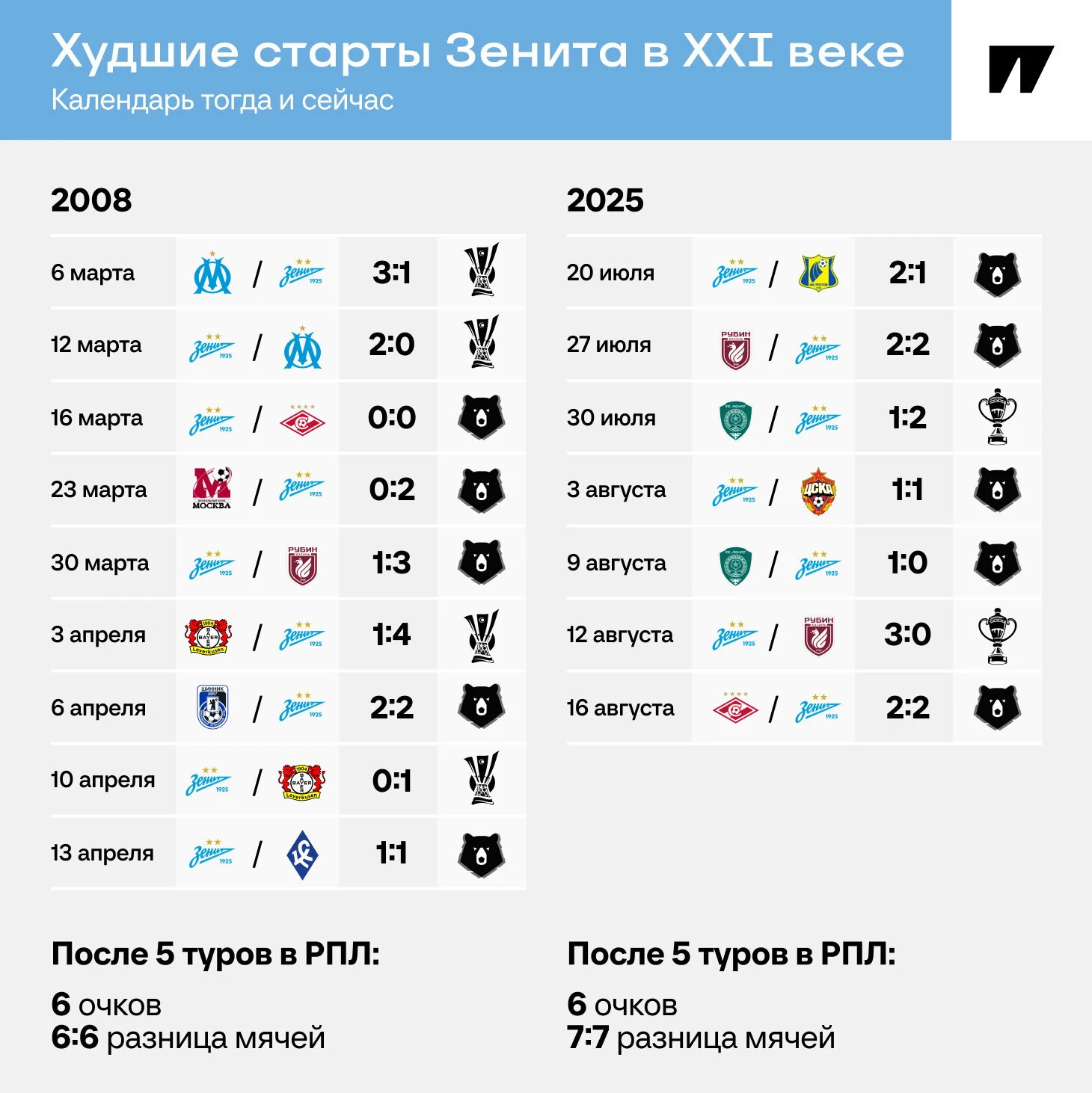 «Зенит» только раз в XXI веке начинал сезон настолько плохо. Это было в 2008-м – сразу после титула. Отличие – только разница мячей.
