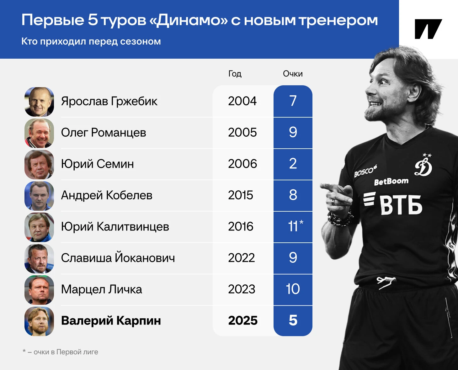 ● Меньше побед за первые пять туров было только у Семина. Правда, и поражений, как правило, было не больше одного. Без них в РПЛ обходились только Ярослав Гржебик и Славиша Йоканович. При этом оба не довели сезон до конца: уже без них «Динамо» финишировало 13-м в 2004-м и девятым в 2023-м.