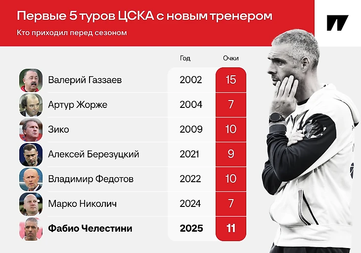 У ЦСКА обратная картина: Фабио Челестини начал почти лучше всех. Вот какие тренеры с 2000-го приходили перед сезоном, лист короче на одну фамилию.