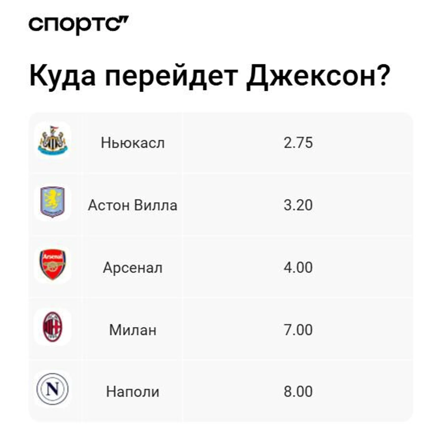 ● Джексон в июле был большим фаворитом на переход в «Ньюкасл» – называли приоритетной заменой для Исака. Сейчас коэффициент значительно подрос.