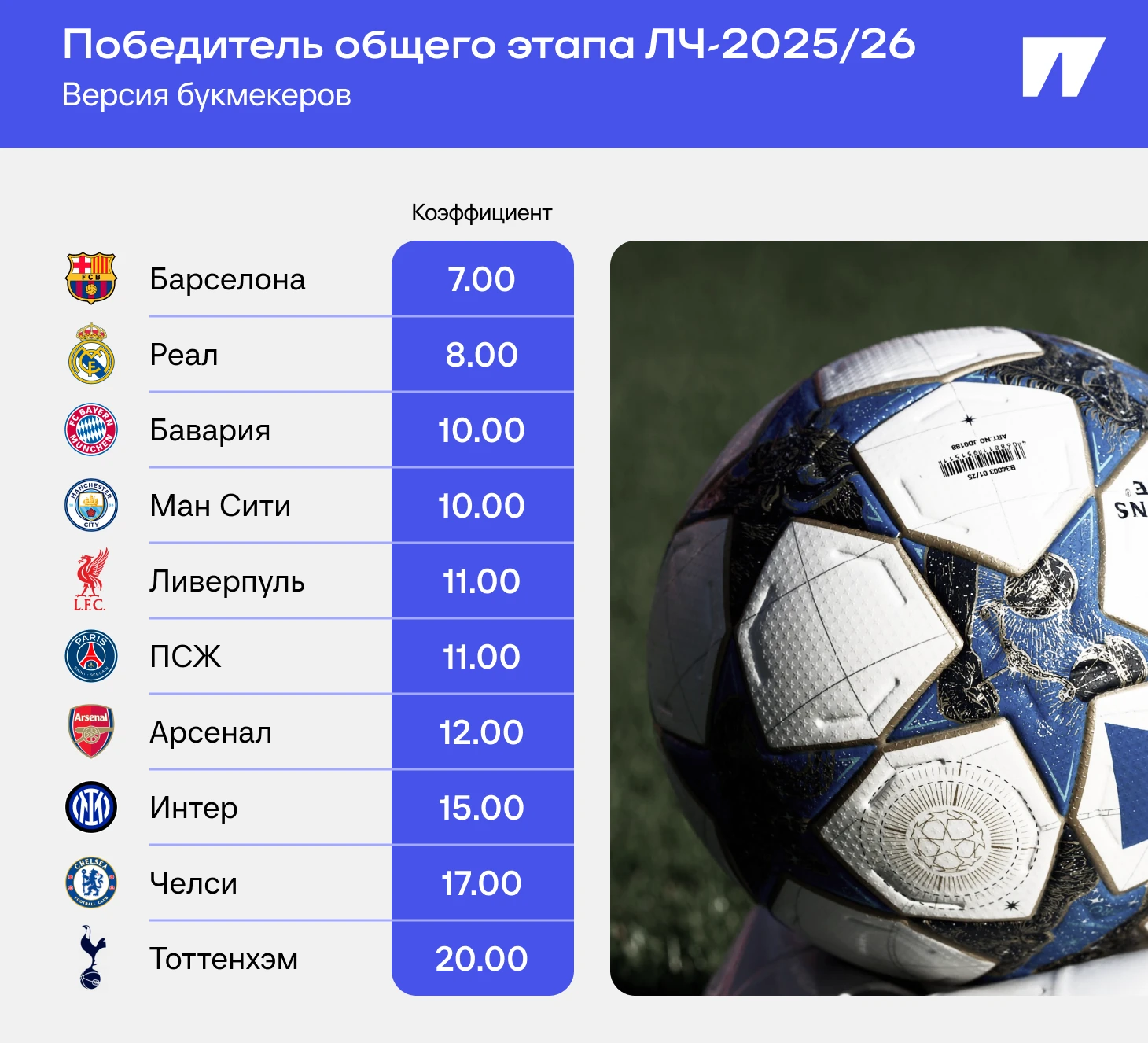 Следом за «Реалом» и «Барсой» идут «Бавария» и «Сити». Немцы и англичане в прошлом сезоне пробивались в плей-офф через стыки, так что к их шансам относятся осторожнее. Далее – два действующих победителя: общего этапа и всей ЛЧ. «Ливерпуль» и «ПСЖ» делят пятую позицию.