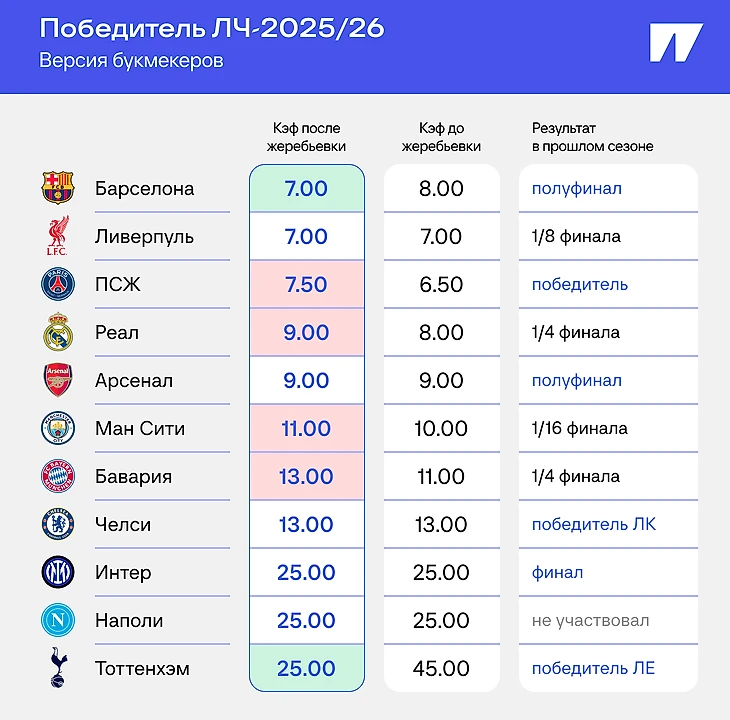 Жеребьевка заметно повлияла на расстановку сил. Еще днем главным фаворитом на титул считался «ПСЖ», теперь первое место в линии делят «Барса» и «Ливерпуль».