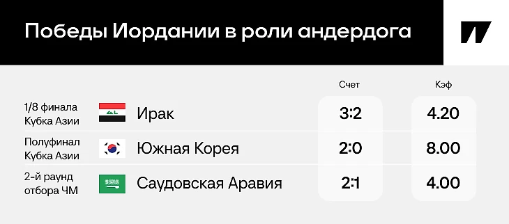 Сборная Иордании – явный аутсайдер до BetBoom товарищеского матча с Россией: коэффициент пока не опускается ниже 8.00. А ведь Иордания – финалист последнего Кубка Азии-2023 (проводился в 2024-м) и уже участник ЧМ-2026.