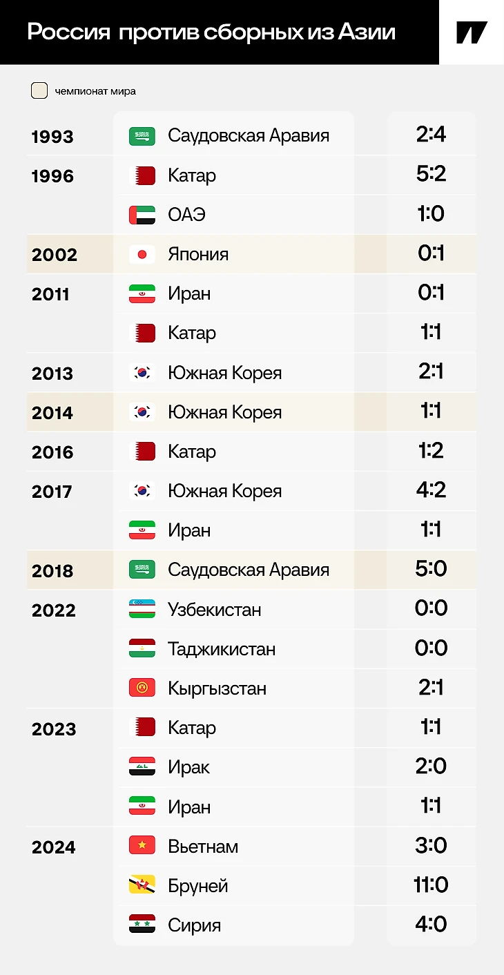 Последний раз проигрывали азиатам девять лет назад – еще со Станиславом Черчесовым. В 2016-м Катар устроил волевую победу после гола Александра Самедова. Пожалуй, самые памятные неудачи связаны с чемпионатами мира: в 2002-м Россия проиграла Японии и после этого не вышла из группы, а в 2014-м случилась фатальная ошибка Игоря Акинфеева против Южной Кореи, он пропустил легкий мяч после дальнего удара, потом компенсировать и попасть в плей-офф тоже не получилось.