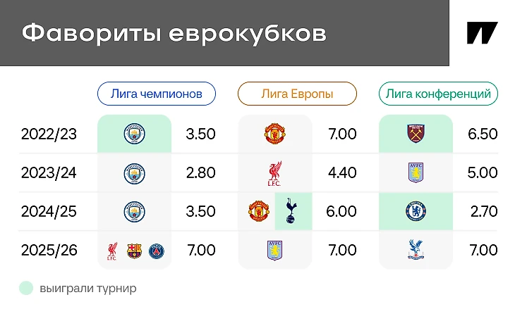 В предыдущий раз английские клубы не были фаворитами еврокубков до сезона-2021/22. Тогда в Лиге чемпионов «ПСЖ» ставили выше «Манчестер Сити», а в Лиге конференций «Рома» опережала «Тоттенхэм». Далее – доминирование, но только в линии.