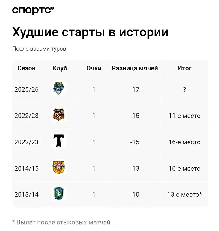 «Сочи» забрал неприятное лидерство у «Урала». В то же время клуб из Екатеринбурга – позитивный пример. В сезоне-2022/23 аутсайдер смог спастись после такого ужасного старта. Тогда команду взбодрил новый тренер Виктор Гончаренко – приятная параллель для «Сочи».