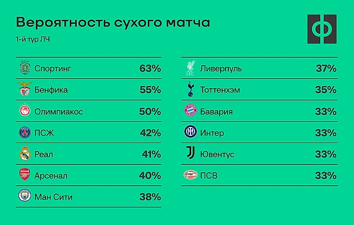 ● «Спортинг» и «Бенфика» – два явных фаворита на сухие матчи. Конечно, расклады на «Кайрат» пугают: меньше 40% даже на один гол «Спортингу». Собственно, оборона полностью из португальских клубов – разумный выбор, в «Бенфике» против «Карабаха» тоже не сомневаются.