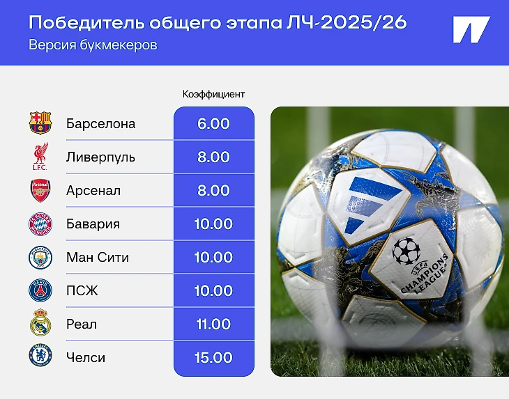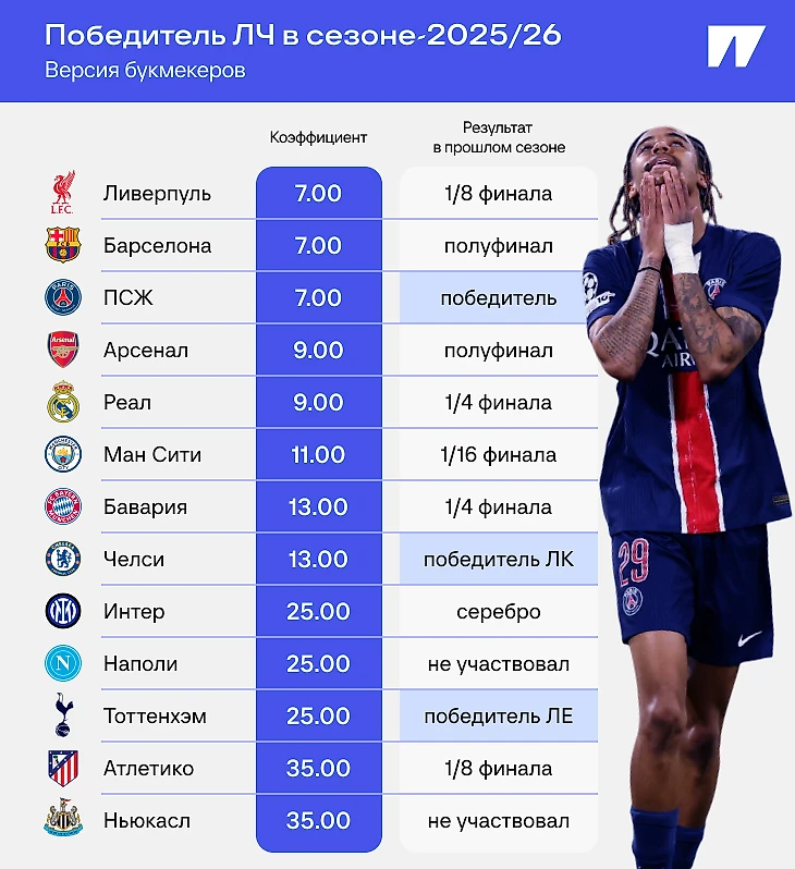 Следом за тройкой фаворитов идут «Бавария», «Ман Сити» и «ПСЖ» (по 10.00). Немцы и англичане в прошлом сезоне пробивались в плей-офф через стыки, так что к их шансам относятся осторожнее. А парижан занизили из-за их сумасшедшего календаря: «Бавария», «Барса», «Аталанта», «Байер», «Тоттенхэм», «Спортинг», «Ньюкасл» и «Атлетик».