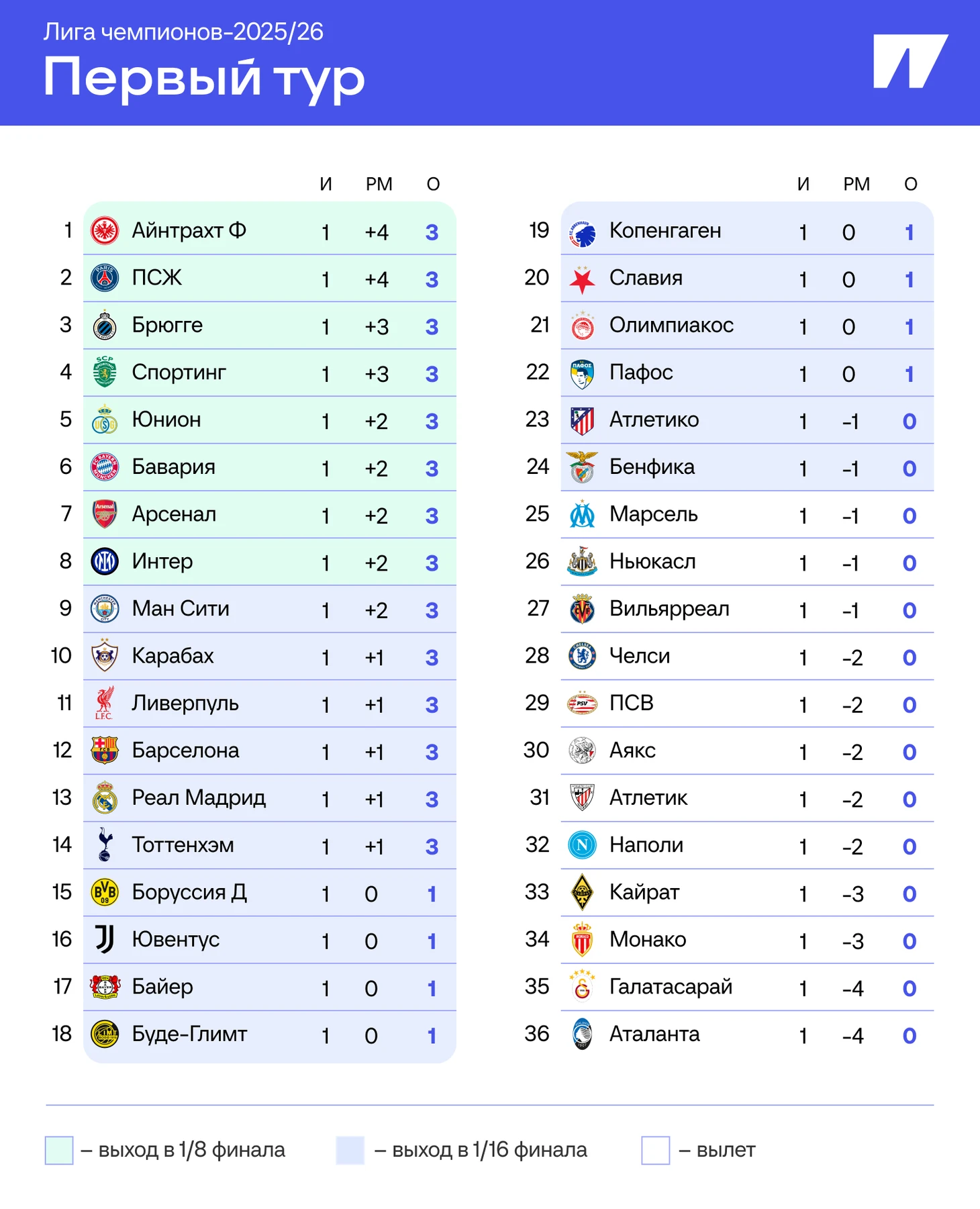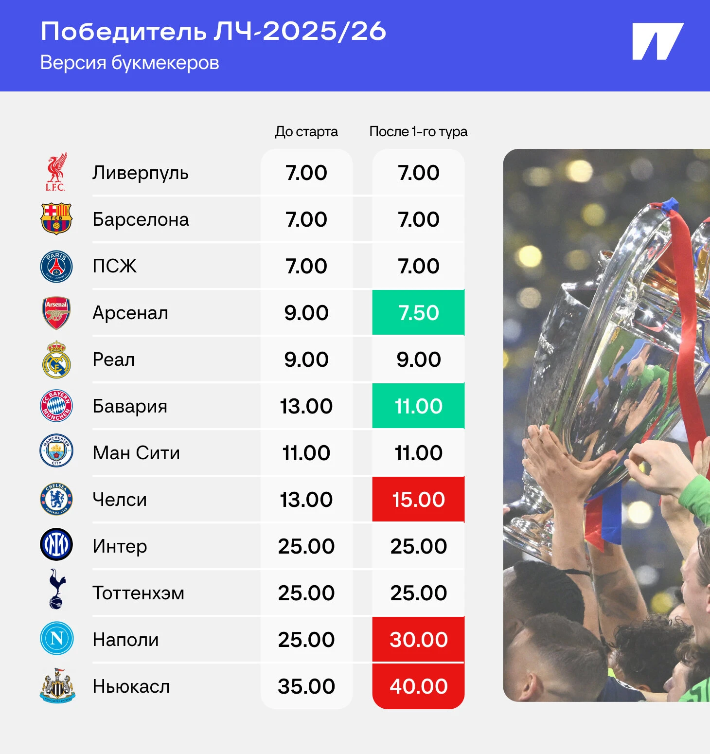 В Лиге чемпионов завершился первый тур общего этапа. Таблица обрела очертания, а в букмекерских котировках первые сдвиги. Смотрим, как изменился расклад фаворитов.