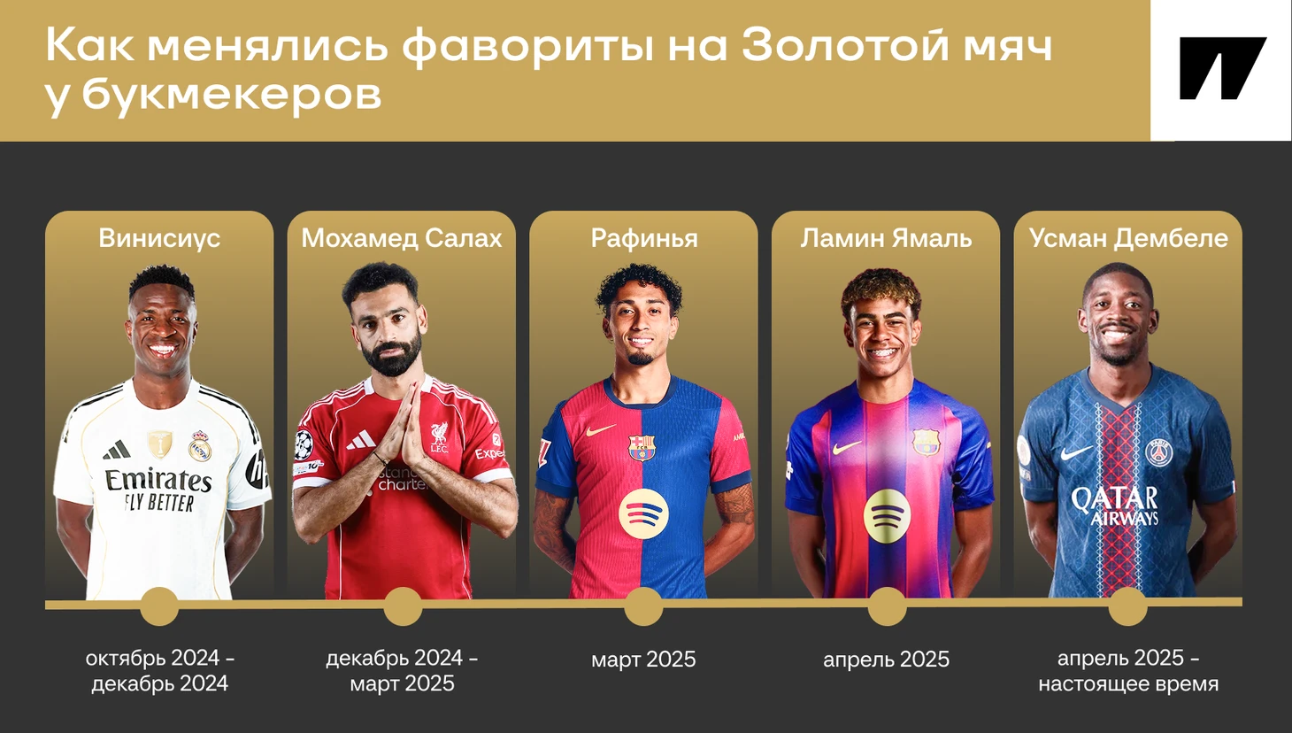 Такой сезон только закрепляет новую эпоху без Криштиану Роналду и Лионеля Месси – теперь выиграть может даже аутсайдер по букмекерским коэффициентам. На Дембеле осенью 2024-го давали 150.00. Француз ворвался в топ-10 только в марте.