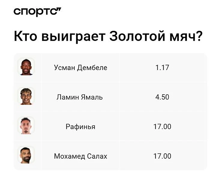 Некоторые букмекеры еще принимают ставки на лучшего футболиста мира именно перед награждением, но таких меньшинство. Все же у аналитиков сомнений в победе Усмана не осталось. Последние доступные коэффициенты плавали в диапазоне 1.15-1.20. Ламин Ямаль – фаворит на второе место (4.50), у некоторых букмекеров доходит до 3.00.