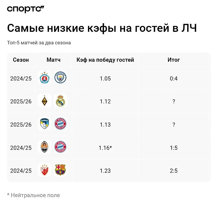● Коэффициенты на «Реал» и «Баварию» в диапазоне 1.12-1.14 – в топ-3 за два сезона.