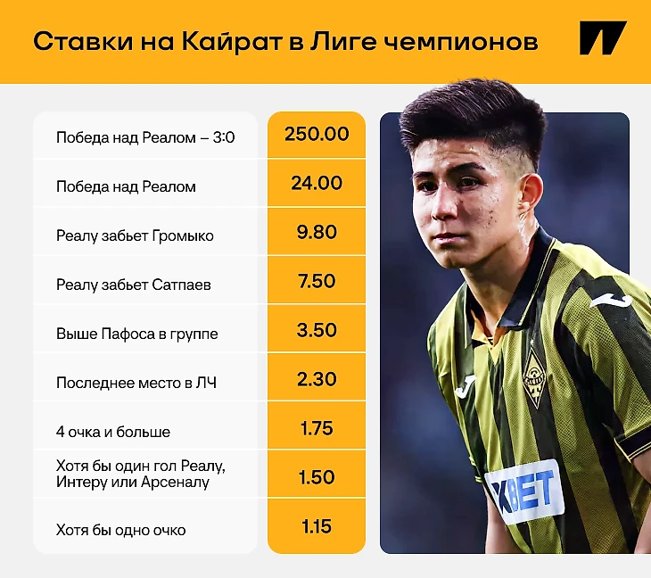 Зато для «Кайрата» уже выкатили специальную линию на потенциальных авторов голов в ворота «Реала». Логичный фаворит – Дастан Сатпаев. Коэффициент на один мяч лидера – 7.50. Самая надежная ставка по вероятности – против Валерия Громыко. Если экс-игрок тульского «Арсенала» не пробьет Тибо Куртуа – пройдет коэффициент 1.02.